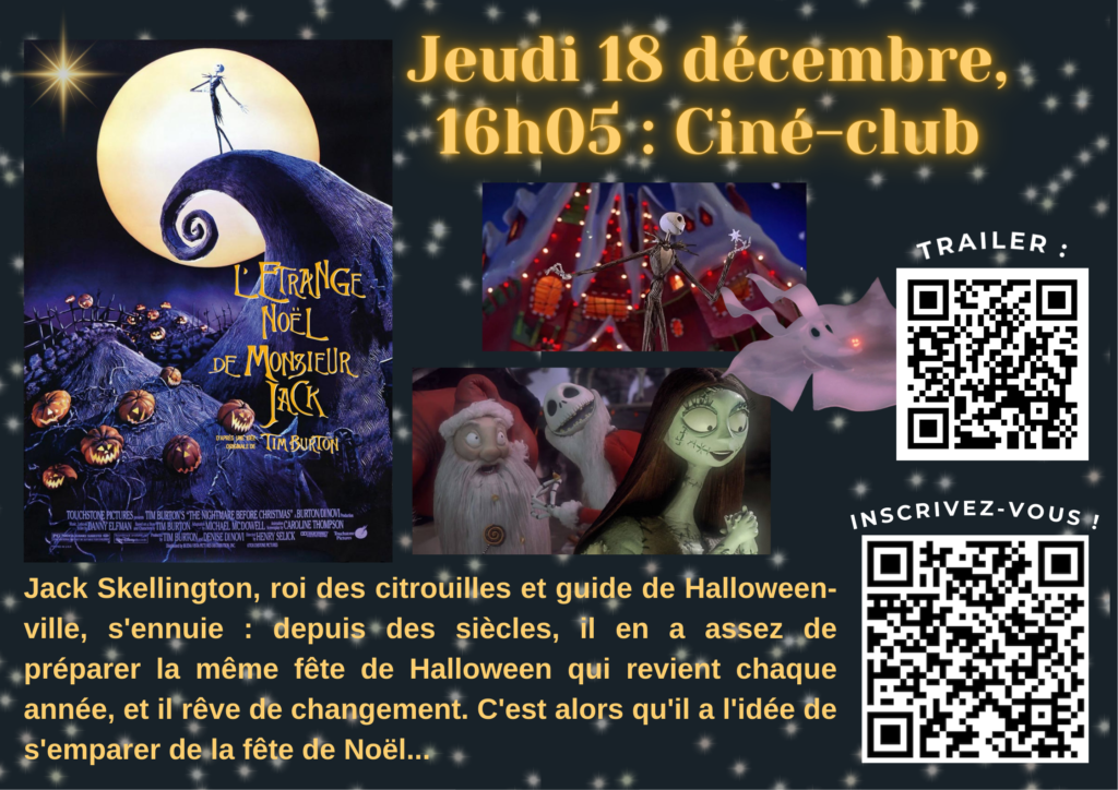 Ce jeudi 18 décembre à la bibliothèque, dès la fin des cours (16h05-16h10), se tiendra une séance spéciale de Noël pour le Ciné Club!